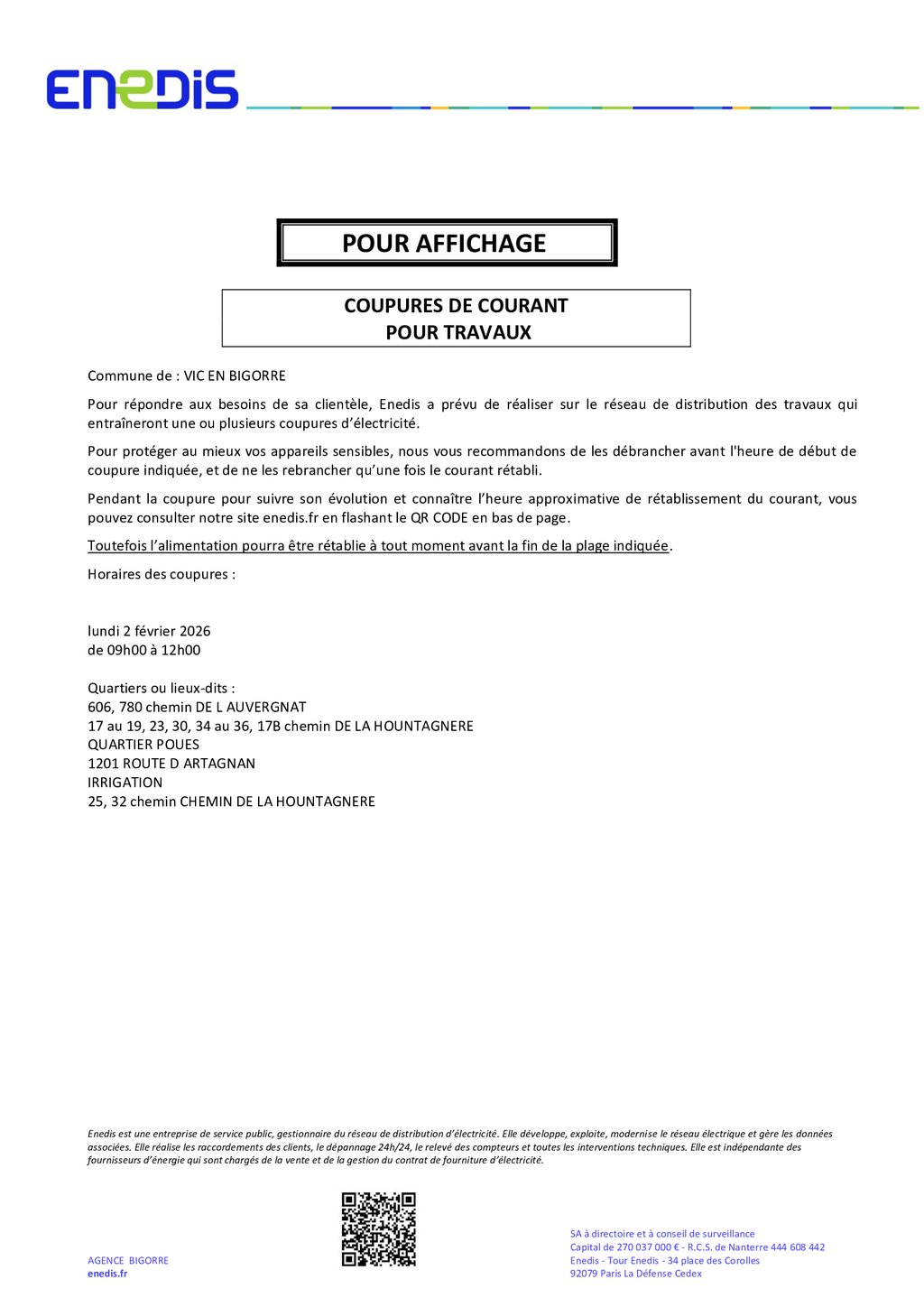 🔧 Enedis informe les habitants de la commune de Vic-en-Bigorre qu’une coupure d’électricité est programmée en raison de travaux sur le réseau de distribution.