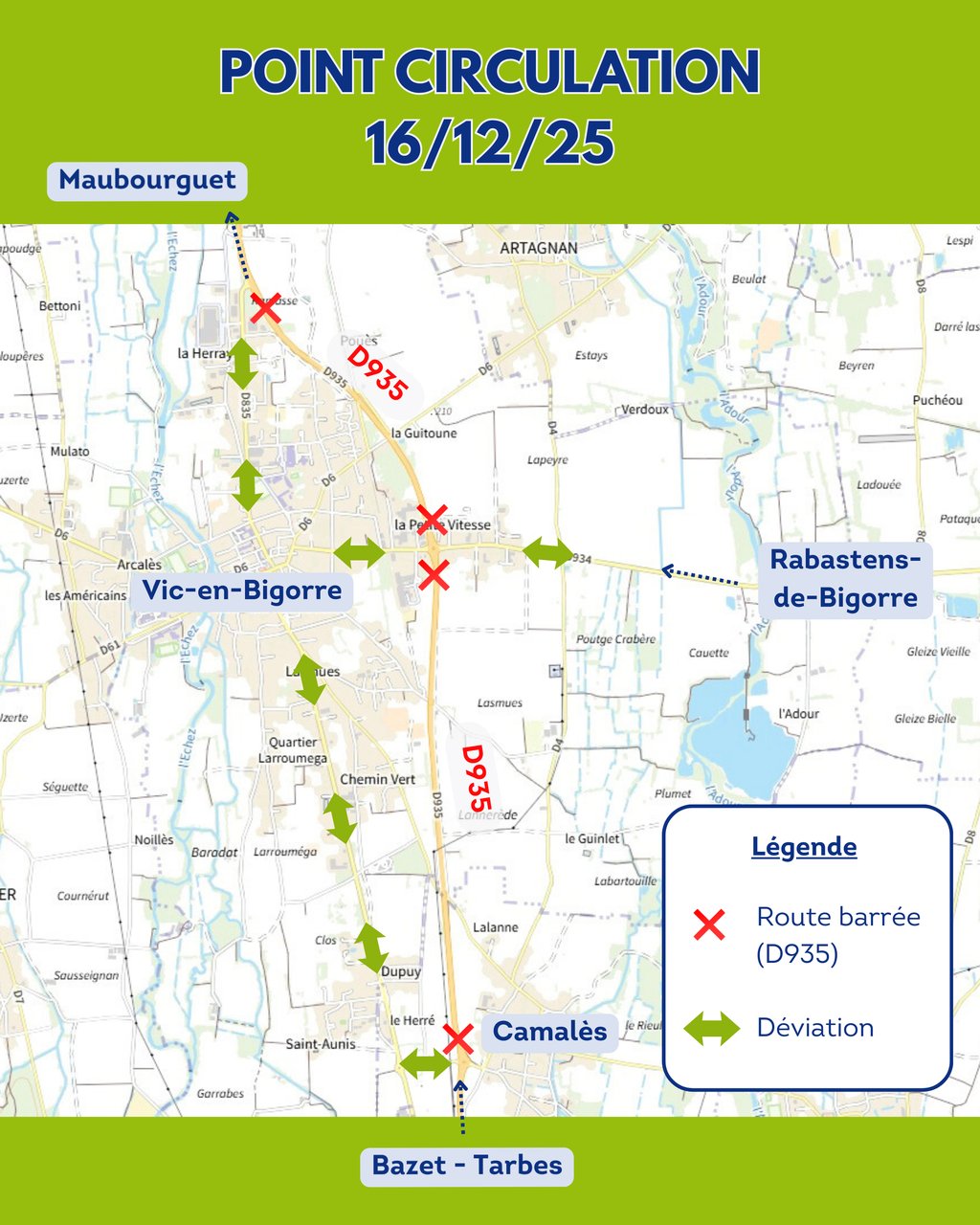 ➡️ La D935 est fermée à la circulation depuis le rond-point de Camalès jusqu’au nord de Vic-en-Bigorre (secteur de La Herray).