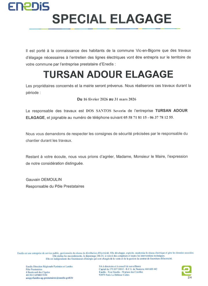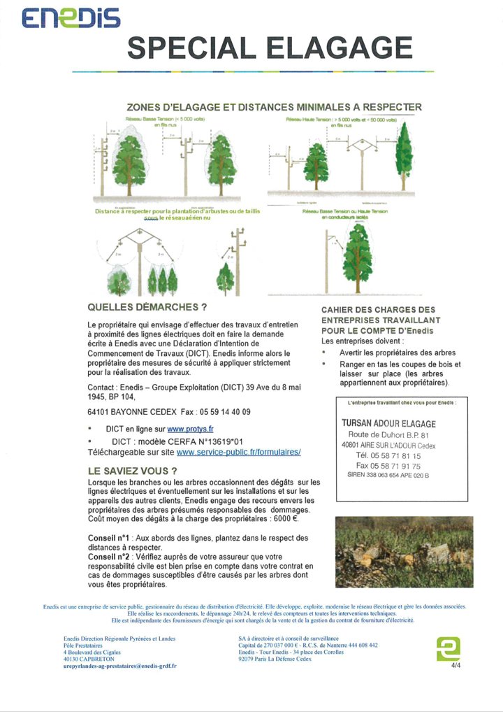 Du 16 février au 31 mars 2026, des travaux d’élagage vont être menés à proximité des lignes électriques par l'entreprise TURSAN ADOUR ELEGAGE, mandatée par ENEDIS. Ces travaux sont nécessaires à l'entretien de lignes électriques.