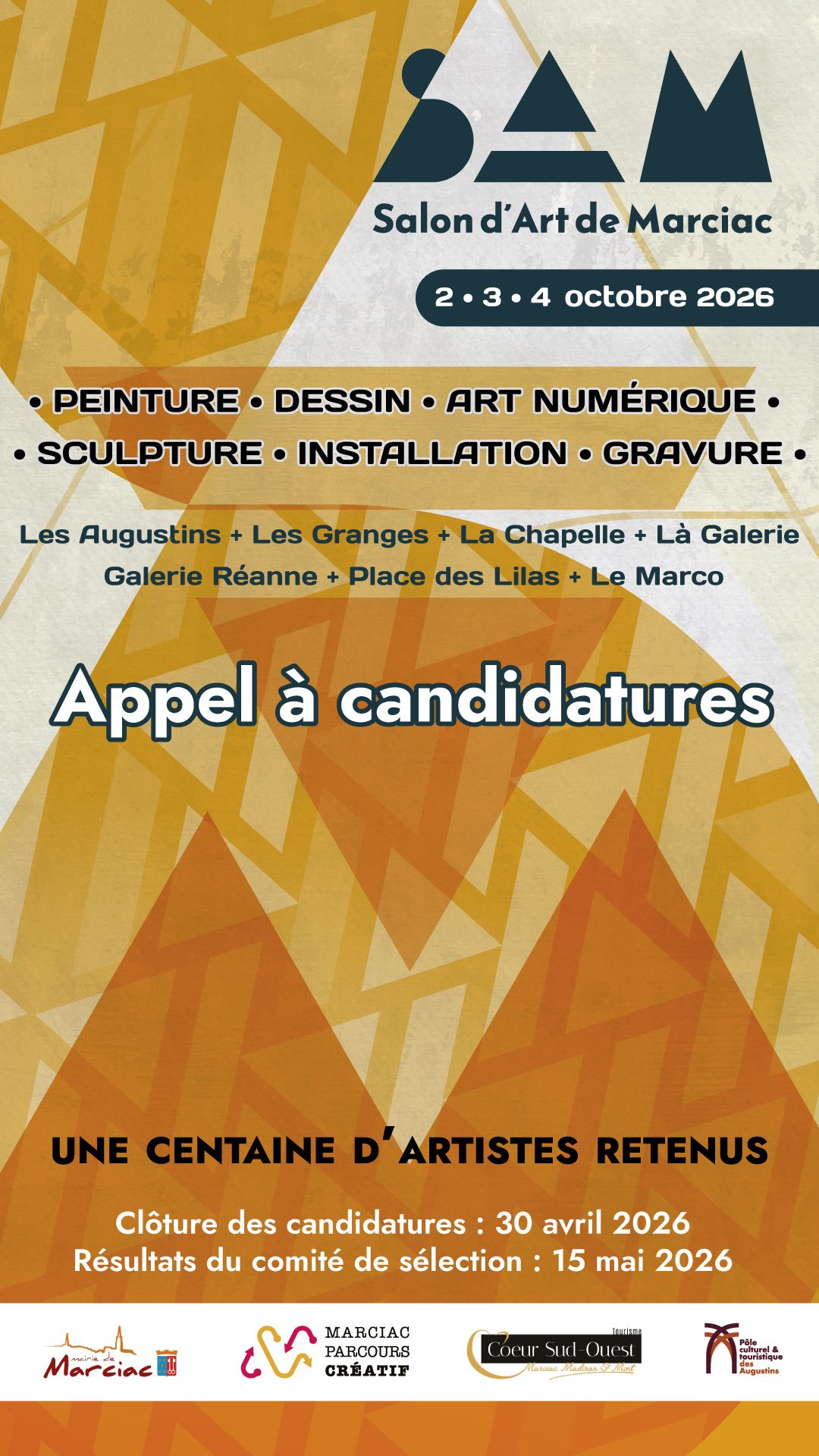 L’association Marciac Parcours Créatif invite les artistes professionnels et amateurs confirmés des environs et d'ailleurs à participer à la toute première édition du Salon d’Art de Marciac (SAM), qui aura lieu du 2 au 4 octobre 2026.